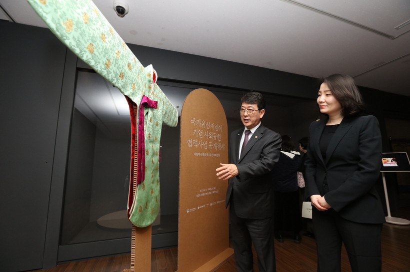 | ▲ 최응천 국가유산청장(왼쪽)과 이홍주 LG생활건강 상무(오른쪽)가 지난 4월 서울 국립고궁박물관에서 열린 ‘조선 왕실, 대한제국 황실 국가유산 복제 성과 공개 행사’에서 영친왕비가 착용했던 소례복(당의) 복제품을 살펴보고 있다.(사진=LG생활건강) |
