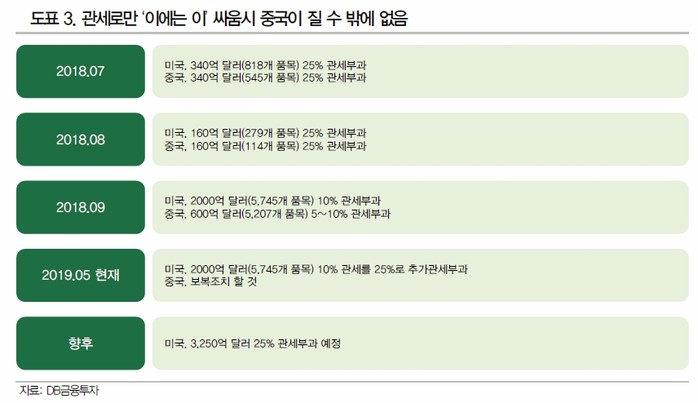 이와 관련 김 연구원은 현재 트럼프가 무역협상이 시작되기 전인 지난 9일에 10일 인상예정이었던 2000억달러 규모 이외에도 3250억달러 중국산 수입품에 대해 25%의 추가관세 부과 서류작업을 진행 중이라고 밝힌 상황에서 중국이 맞불작전으로 가기는 어려울 것이라고 내다봤다.