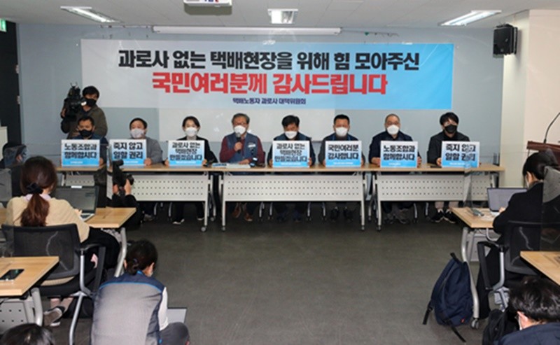 | ▲ 21일 오후 서울 서대문구 전국서비스산업노동조합연맹에서 택배노동자 과로사 대책위원회 구성원들이 기자회견을 하고 있다. (사진=뉴시스) |