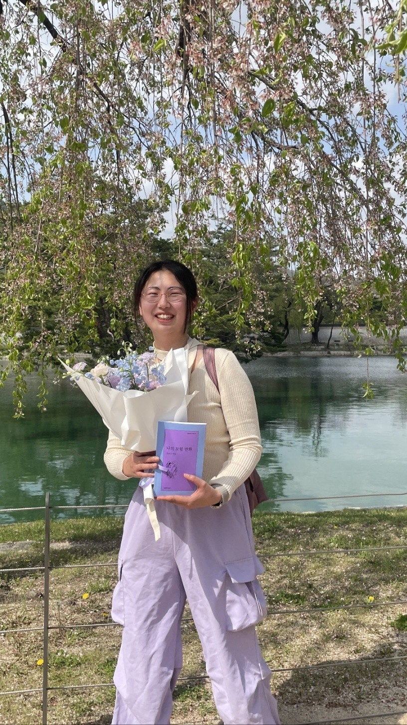 | ▲ 봄날 경복궁에서, 친구가 선물해 준 시집의 표지 색이 같은 꽃다발을 안은 모습 |