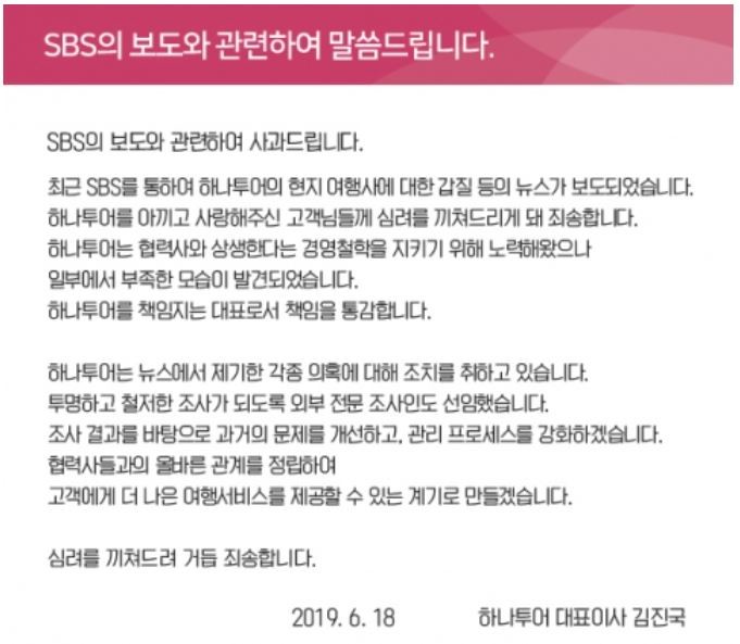 해당 보도에 대해 하나투어 측은 "회사에서는 여행상품 지상비의 일부를 청구기간 내에 청구하지 않고 대신 미청구액을 나중에 다른 여행상품 지상비에 추가해 청구하는 행위를 금지하고 있으나 홍콩의 한 현지 여행사인 W사의 경우 이런 거래가 일부 있었던 것으로 확인됐다"고 인정 한 바 있다.