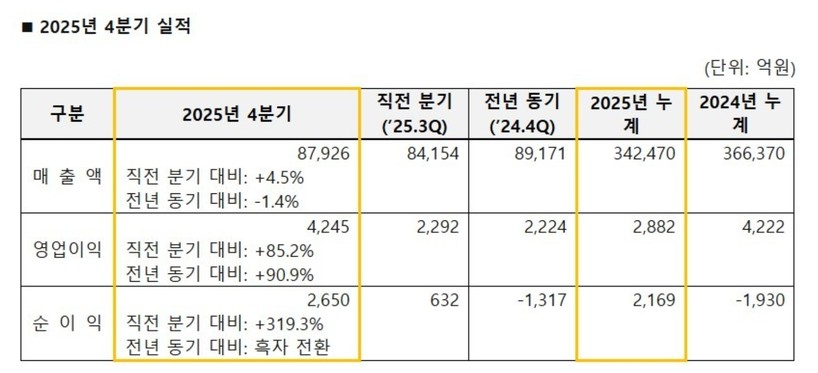 2025년 4분기 매출액은 8조7926억원으로 전 분기 대비 증가했으며, 영업이익은 4245억원을 기록해 큰 폭의 개선을 나타냈다. 특히 정제마진 회복과 윤활 부문의 안정적인 수익 창출이 실적 반등을 이끌었다는 평가다.