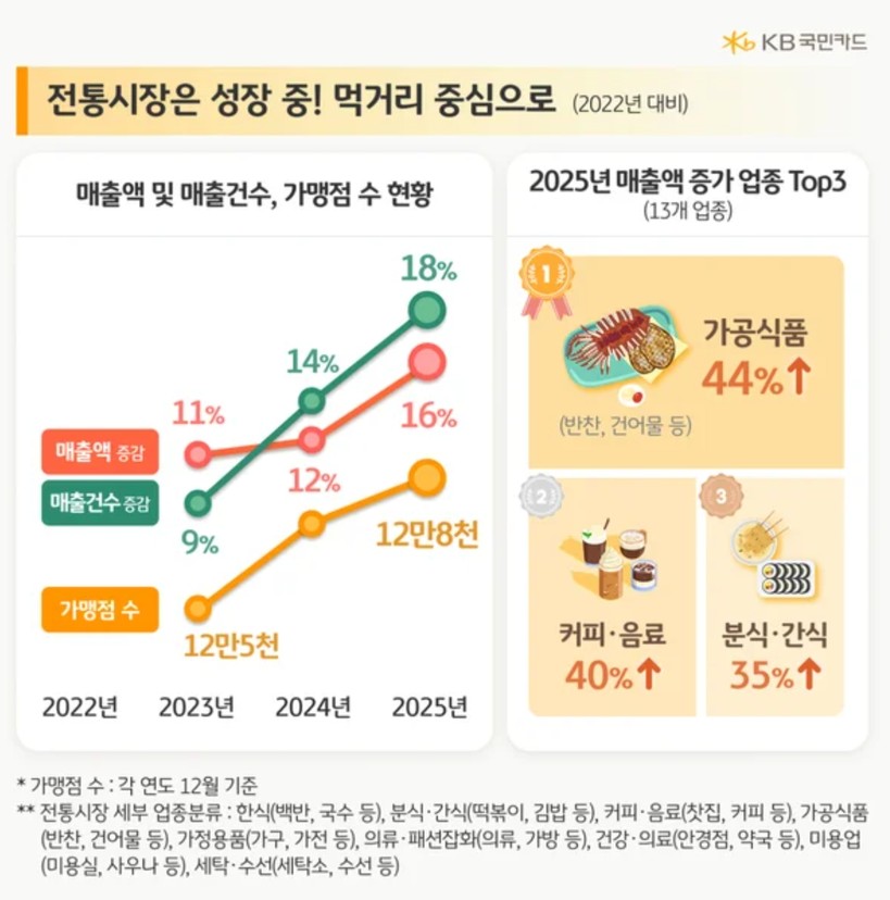 소비 패턴 변화도 두드러진다. 가공식품과 커피·음료, 분식·간식 등 외식 및 간편식 관련 업종이 높은 매출 증가율을 기록하며 전통시장 내 업종 다변화가 진행되고 있다. 이는 기존 농수축산물 중심 소비에 더해 외식과 간식 소비가 결합된 ‘복합 소비 구조’가 자리 잡고 있음을 보여준다.