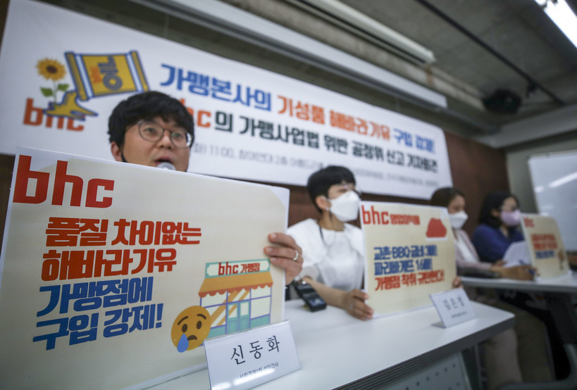 | ▲ 지난해 민변 민생경제위원회, 전국가맹점주협의회, 참여연대 등은 bhc본사가 가맹점들을 상대로 기성품 해바라기유 구입을 강제한 것과 관련해 기자회견열고 bhc그룹을 공정위에 신고했다. <사진=뉴시스> |