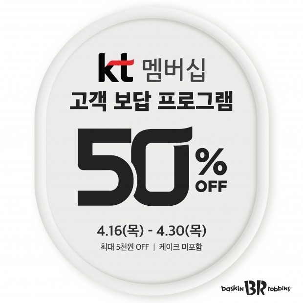 양사는 이달 30일까지 ‘고객 보답 프로그램’을 운영하며 KT 멤버십 고객을 대상으로 할인 혜택을 제공한다. 행사 기간 동안 멤버십 바코드를 제시하면 배스킨라빈스 매장에서 아이스크림 케이크를 제외한 전 제품에 대해 최대 50% 할인, 최대 5000원까지 혜택을 받을 수 있다.