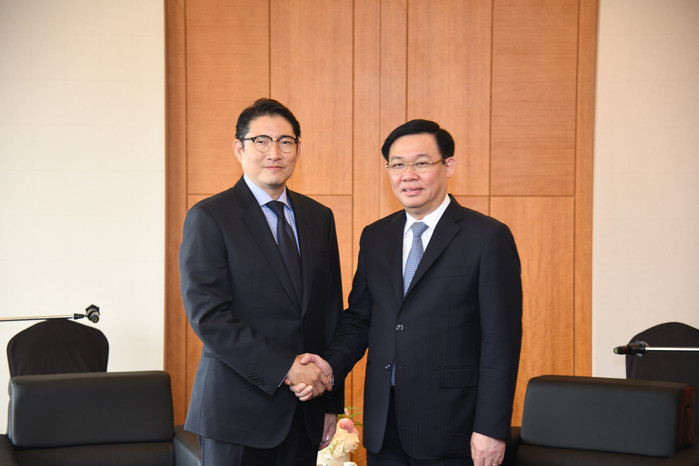 | ▲ 조현준 효성 회장(왼쪽)이 19일 브엉 딘 후에(Vuong Dinh Hue) 베트남 부총리(오른쪽)와 만나 상호 협력을 강화해 나가기로 약속했다.(사진=효성그룹 제공) |