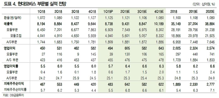 DB금융투자에 따르면 현대모비스의 올해 1분기 실적부진은 중국 1공장 가동 중단 영향과 모듈부문의 수익성 회복이 시장기대치를 못 미쳤기 때문이다.