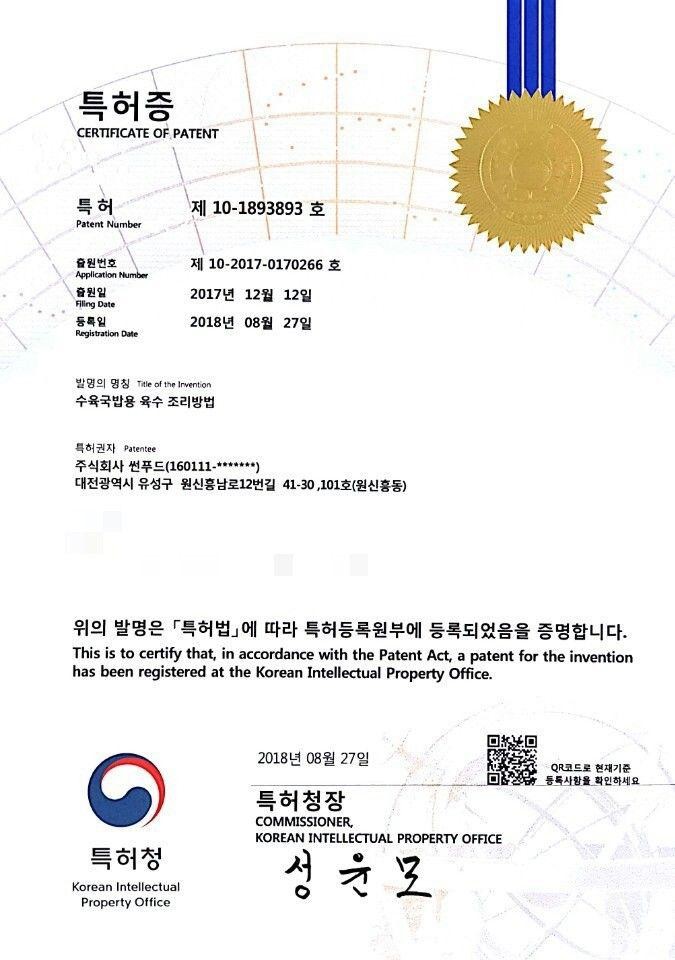 (주)썬푸드, 옛날 국밥 제조방법 복원해 특허청으로부터 특허 획득