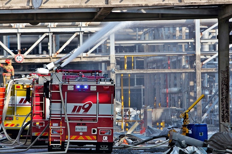 | ▲충남 서산시 대산읍 롯데케미칼 대산공장에서 발생한 폭발사고로 4일 오전 9시 54분 소방 펌프차가 폭발 현장에 물을 뿌리고 있다. |