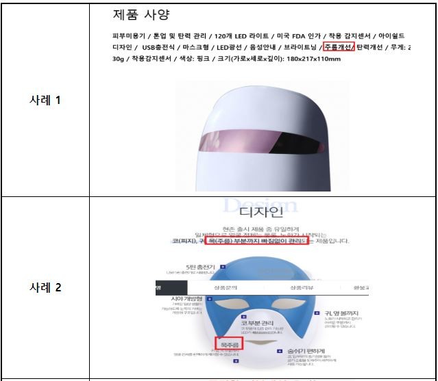 이들 광고는 의료기기로 허가받지 않았을 뿐더러 효능·효과가 검증된바 없는 일반 공산품임에도 '주름 개선', '안면 리프팅', '기미·여드름 완화', '피부질환 치료/완화' 등의 효능·효과를 표방해 의료기기로 오인할 수 있도록 광고한 것으로 드러났다.