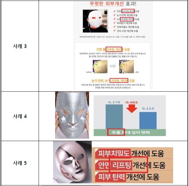 광고 위반 사례를 보면 교원웰스LED마스크, LG전자프라엘더마LED마스크, 삼성셀리턴LED마스크, 클렙튼티에스트더마LED마스크, 엘리닉LED마스크, 코스메카코스메티LED마스크, 아름다운연구소LED마스크, 알리바바LED마스크, SJ상사미스터고물상LED뷰티마스크, 닥터아이헬스보이256LED마스크, 미룩스LED마스크, 프렌디LED마스크 등 48개 업체들이 적발됐으며 목 등 주름개선, 리프팅 개선, 여드름 케어, 염증개선 등에 효과가 있는 것처럼 온라인상에서 광고했다.