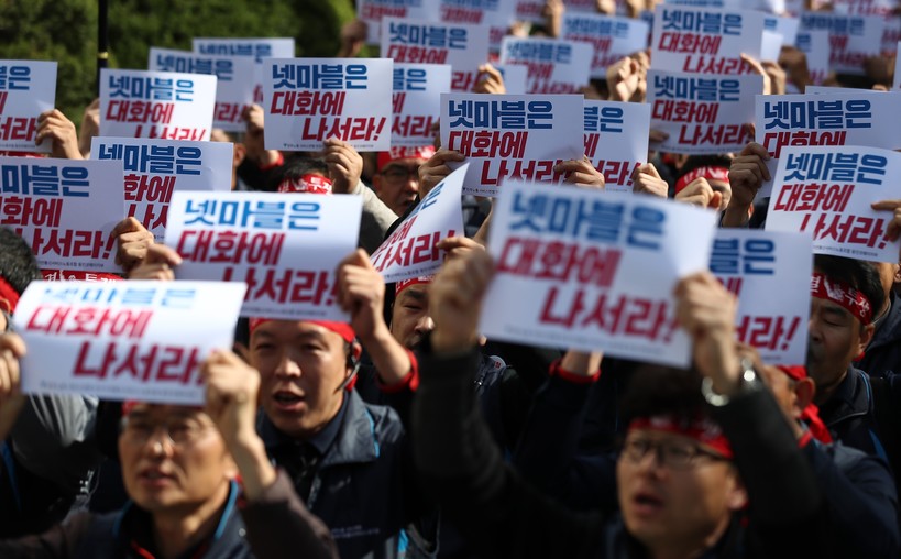 | ▲ 전국가전통신서비스노동조합 웅진코웨이지부 조합원들이 서울 구로구 넷마블 앞에서 웅진코웨이의 우선협상대상자인 넷마블에게 면담을 요구하며 구호를 외치고 있다. (사진=뉴시스) |