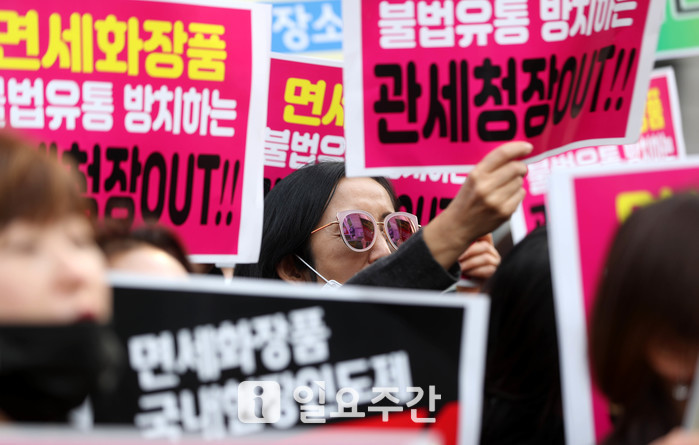 | ▲ 전국화장품가맹점연합회와 전국가맹점주협의회가 지난 3월19일 서울 중구 롯데면세점 앞에서 집회를 열고 면세화장품 불법유통 근절을 촉구하고 있는 모습. |