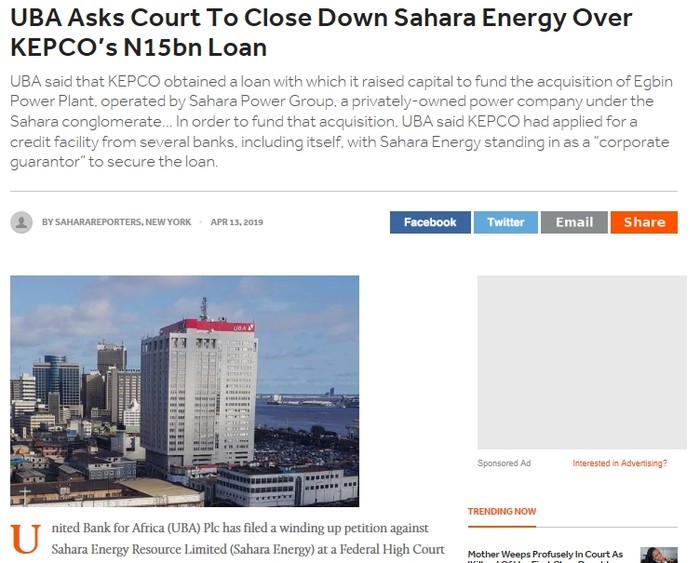 UBA는 “한전이 엑빈전력발전소의 인수를 위해 대출을 받았다”며 “한전은 UBA 이외 다른 몇 개 은행에서도 대출을 받았는데 이때 사하라에너지가 보증을 섰다”고 보도했다.