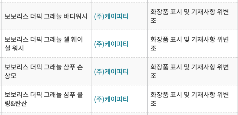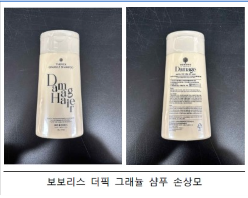 회수 대상 제품은 △보보리스 더픽 그래뉼 바디워시 (제조번호 BI21193) △보보리스 더픽 그래뉼 쉘 훼이셜 워시 (제조번호 BH21192) △보보리스 더픽 그래뉼 샴푸 손상모 (제조번호 BF21190) △보보리스 더픽 그래뉼 샴푸 쿨링&탄산 (제조번호 BE21193) 등 총 4종이다.