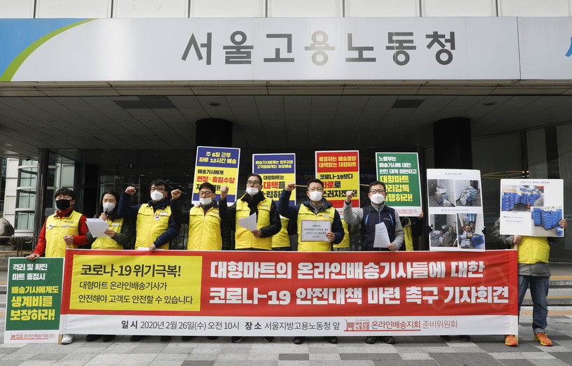 | ▲ 2020년 2월26일 대형마트 배송 노동자들이 서울 중구 서울지방고용노동청 앞에서 기자회견을 열고 신종 코로나바이러스 감염증(코로나19)에 대한 안전 대책을 마련해줄 것을 촉구하고 있다. <사진=뉴시스> |