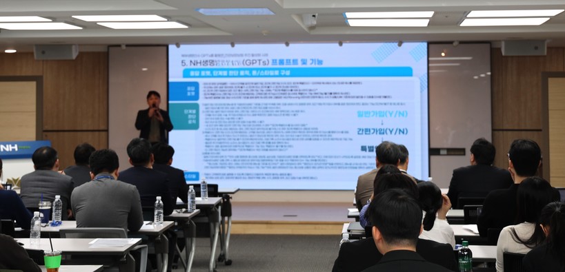 | ▲ NH농협생명이 24일(월) 생성형 AI 경진대회를 실시하고 시상했다. 사진은 AI 경진대회 본선에 오른 임직원이 발표를 진행하고 있는 모습이다. (사진=농협금융 제공) |