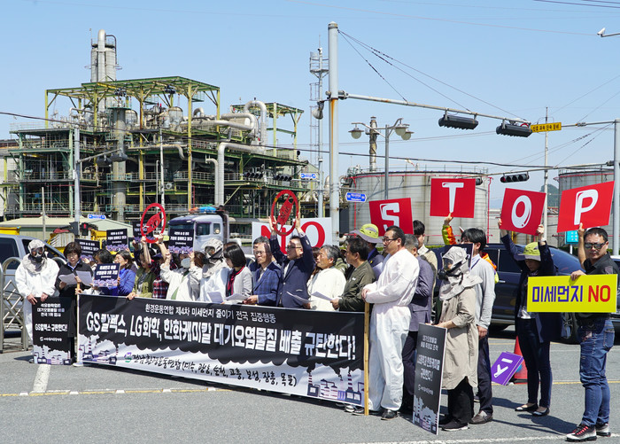 | ▲ 지난 4월 18일 GS칼텍스여수1공장앞에서 여수환경운동연합 등 전남환경운동연합소속 7개 단체가 대기오염물질배출 측정값 조작 LG화학과 한화케미칼 규탄 기자회견을 갖고 있는 모습.(사진=newsis) |