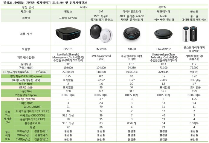 차량 내 발생하는 악취 및 휘발성 유기화합물(VOCS)의 제거능력을 시험한 결과 제품별로 차이가 큰 것으로 나타났으며 9개 제품 중 7개 제품은 유해가스제거율 4%~23%로 유해가스 제거 효과가 미비한 것으로 나타났다. CA인증('Clean Air'의 약자로 한국공기청정협회에서 주는 민간 인증으로 공기청정기의 중요 기능이 적합 판정을 받은 제품에 부여)기준은 유해가스제거율 60%이상이다.