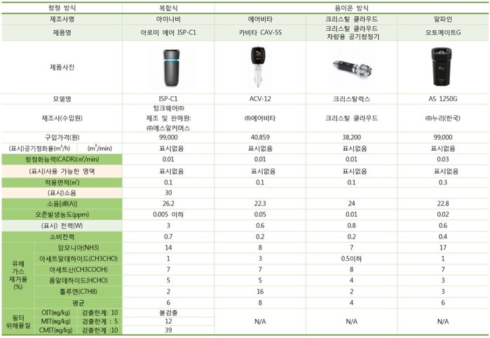 시험대상 제품 중 ‘아이나비 아로미에어ISP-C1’, ‘에어비타 카비타 CAV-5S’, ‘크리스탈 클라우드’, ‘알파인 오토메이트 G’는 공기청정화 능력 0.1(㎥/min ) 미만으로 청정 효과가 미흡했다.