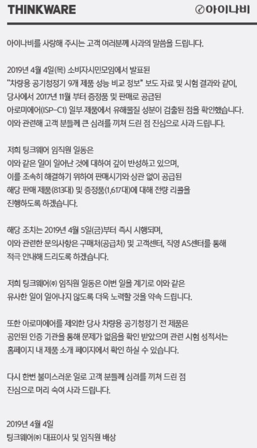 ▲팅크웨어(주)는 아이나비 차량용 공기청정기 필터에서 위해 물질이 발견되 것과 관련 자사 홈페이지에 사과문을 게재했다. |