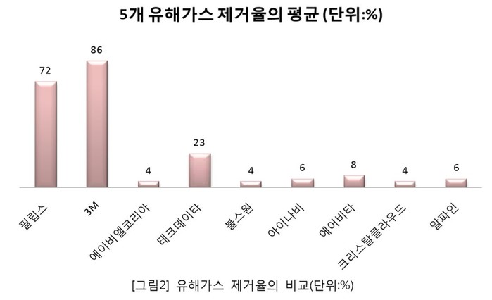 시험대상 9개 제품의 유해가스 제거율은 최소 4%~최대 86%로 제품 별로 차이가 많이 나타났으며 필터식 2개 제품(‘3M’ 86%,‘필립스’ 72%)은 CA인증기준인 유해가스 제거율 60% 이상으로 나타났다.