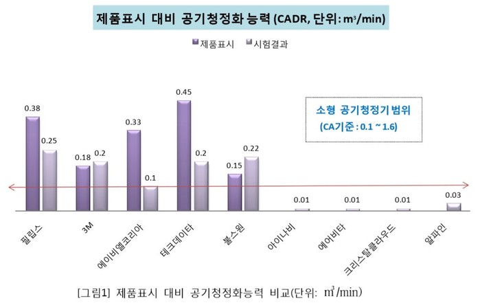 공기청정화능력이 표시·광고된 5개 제품의 표시대비 공기청정화능력을 비교 한 결과 2개 제품은 표시치 이상(‘3M’,‘불스원’)으로 나타났으나 3개 제품은 표시치의 30.3%(에이비엘코리아, ABSL 퓨어존)~65.8%(필립스 고퓨 어 GP7101) 수준으로 제품 표시 광고 기준에는 미치지 못하는 것으로 조사됐다.