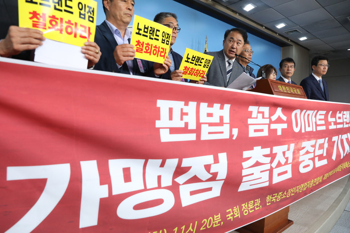 | ▲ 정의당과 한국중소장인자영업총연합회 등 시민사회단체 회원들이 지난 5월 서울 여의도 국회에서 '편법, 꼼수 이마트 노브랜드 가맹점 출점 중단 기자회견'을 하고 있는 모습. |