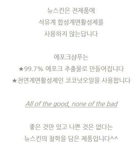또 ’뉴스킨의 모든 제품은 약산성 제품‘이라며 에포크샴푸는 환경호르몬의 일종인 ’합성계면활성제‘로부터 안전해 남녀노소 누구나 사용가능하다고 적극 권장하고 있다.