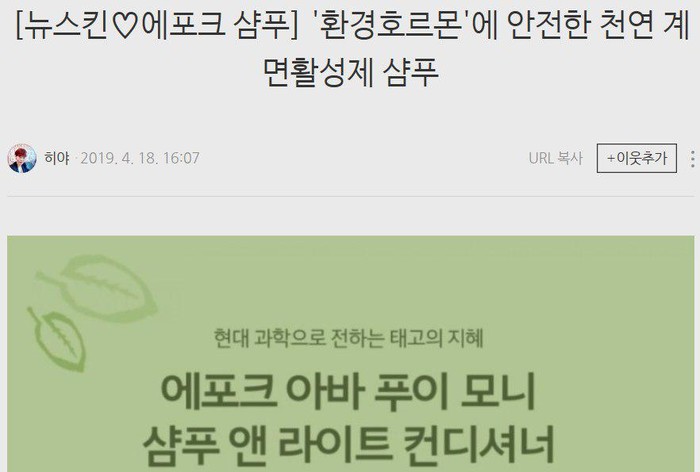 뉴스킨코리아의 일부 개인 사업자들은 블로그를 통해 에포크 샴푸에 대해 유해물질이 들어 있지 않은 천연 제품이라고 홍보해오고 있다. 현재 네이버 블로그를 살펴보면 뉴스킨의 에포크 샴푸는 '환경호르몬에 안전한 천연 계면활성제 샴푸‘, ’환경호르몬 없는 샴푸‘, ’자연친화적인 샴푸‘ 등의 홍보성 글들이 노출되고 있다.