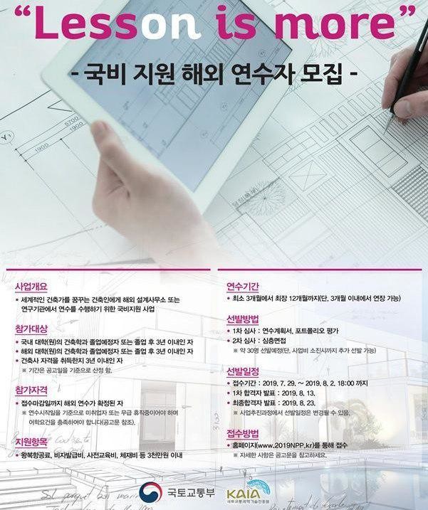 아울러 국토교통부는 사업이 지속적으로 확대될 수 있도록 사업 시행기관인 국토교통과학기술진흥원과 함께 해외 유수의 설계사무소에 국내 건축인들을 위한 별도의 연수 자리를 미리 확보하기 위한 노력도 병행할 계획이다.