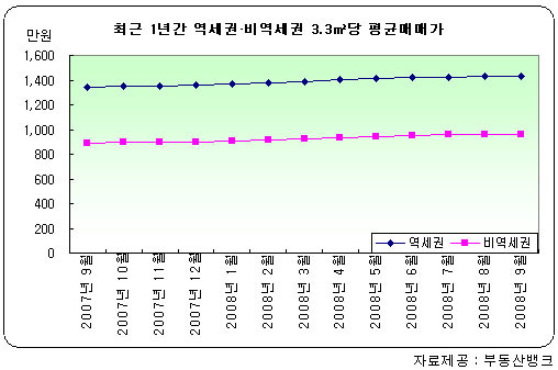 지난달(9월 기준) 역세권 단지의 3.3㎥당 평균매매가는 1,433만원으로 비역세권 단지에 비해 476만원 높았다. 특히, 역세권 단지는 2007년 1월~2007년 9월 기준으로 1.81%(1,321만→1,345만원) 상승했으며, 지난해 같은 기간 대비 현재 4.93%(1,366만→1,433만원) 오름폭을 보이면서 꾸준하게 증가한 것으로 조사됐다.