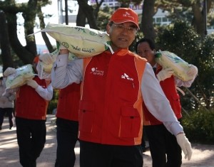 | ▲ SK에너지 신헌철 부회장이 16일 부산 기장군 월내면의 저소득층을 위한 무료급식소에 쌀을 운반하고 있다. | ||
