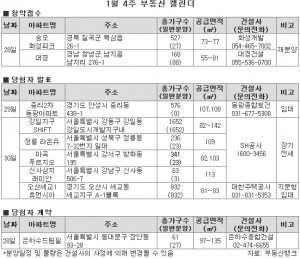 부동산뱅크에 따르면, 1월 마지막주 전국에서 총 2곳 115가구가 공급된다. 또한 모집공고 1곳, 당첨자 발표 6곳, 당첨자 계약 1곳이 돼 있다.
