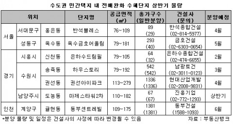일례로 공공택지 전매제한 완화 발표 이후 판교신도시에서 분양한 중대형 민간아파트의 경우, 뛰어난 입지·가격경쟁력에 전매제한 기간 단축 등의 호재와 맞물려 불황 속에서도 뜨거운 청약 경쟁률을 기록한 만큼, 이번 민간택지의 전매제한 완화로 현행 과밀억제권역인 서울, 인천(일부 지역 제외), 의정부시, 구리시, 남양주, 하남시, 고양시, 수원시, 성남시, 안양시, 부천시, 시흥시 등지로 관심이 모아질 것으로 보인다.