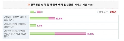 ‘혈액형별 성격 및 궁합에 대해 선입견을 가지고 있나’라는 질문에 응답자의 92.9%가 혈액형별 성격 및 궁합에 대해 의식하고 있다고 대답했다. ‘대부분 일치하는 것 같다’는 대답은 28.6%, ‘약간의 선입견을 가지고 참고만 한다’는 대답이 64.3%를 차지했다. ‘전혀 근거 없는 정보다’라며 혈액형별 성격 분류를 믿지 않는 응답자는 7.1%에 그쳤다.