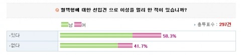 한편, ‘혈액형에 대한 선입견으로 이성을 실제로 멀리한적이 있는가’라는 질문에 절반이 넘는 58.3%의 응답자가 ‘있다’고 대답했다. ‘없다’는 대답도 41.7%로 선입견이 있더라도 실제로 이성을 멀리하는 등의 실행에 옮기는 경우는 없다고 대답한 응답자도 적지 않았다.