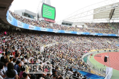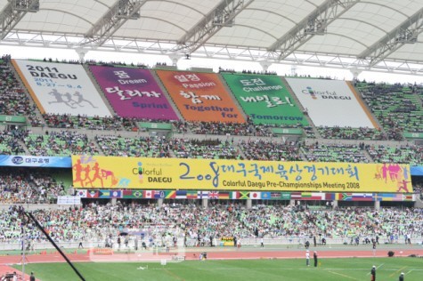 | ▲ 지난해 9월25일 대구스타디움에서는 한 시즌을 마무리하기위해 대회에 참가한 육상스타들을 볼 수 있는 자리가 마련됐다. 2008년 베이징올림픽 메달리스트들과 31개국 130여명의 선수가 참가해 오후 3시25분부터 5시40분까지 16개 종목에서 다시 한번 자신의 기록에 도전했다. 본 경기에 앞서 김범일 대구시장, 김관용 경북도지사, 박근혜 국회의원 등 많은 내빈들과 5만명이 넘는 관중들이 함께 대회성공을 기원하는 박수를 보내며 선수들을 응원했다. | ||
