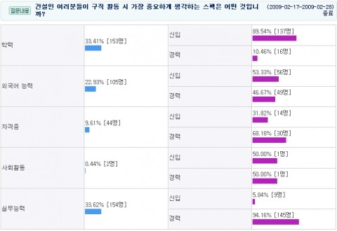 건설취업 콘잡이 2009년 2월 17일 ~ 2009년 2월 28일까지 자사 사이트 회원 458명을 대상으로 ‘건설인 여러분들이 구직 활동 시 가장 중요하게 생각하는 스펙은 어떤 것입니까?’ 라는 주제로 설문 조사를 실시한 결과 전체(458명)의 33,62%(154명)가 ‘실무능력’, 33.41%(153명)가 ‘학력’ 이라고 대답했다.