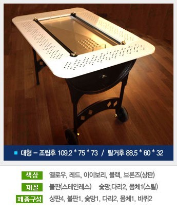 대형 바퀴가 있어 손쉽게 이동가능하며 해체 조립이 간단하다. 스텐레스를 이용한 그릴이라 색이 바래거나 녹슬지 않으며 세척이 간편·위생적이다.