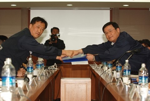 ▲ 현대자동차 노사는 31일에 열린 물량공동위에서 글로벌 경쟁력을 갖추고 있는 소형차의 생산 및 판매 확대를 위해 공장간 생산물량 조정에 전격 합의했다. 왼쪽 윤해모 금속노조 현대차 지부장 , 강호돈 현대차 울산공장장 |