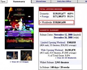 현재 박스오피스모조에 따르면 “슬럼독 밀리어네어”는 미국 1억 3,955만 달러, 전세계 흥행수입 3억 1,086만달러를 돌파했다. 전세계 3억 달러 흥행성적은 여름철을 뜨겁게 달구는 초특급 블록버스터 영화의 흥행기준선도 뛰어넘는 대기록이며 제작비 1400만 달러가 투입된 영화로써는 기적과도 같은 흥행성적표라고 평할 수 있다.