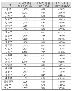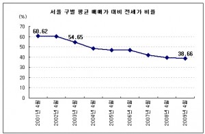 부동산뱅크에 따르면 서울 구별 3.3㎡당 매매가 대비 전세가 비율은 현재(4월 2주 기준) 평균 38.66%로 지난 2001년부터 매년 하락하고 있는 것으로 나타났다. 지난 2001년 4월말 60.62%를 기록한 이후 2003년 4월말 54.65%로 매매가와 전세가의 차이가 계속 벌어져 현재는 40%를 밑도는 것으로 조사됐다.