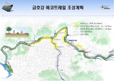 대구시는 금호강과 낙동강을 하나의 길로 연결하여 시민들이 아름다운 수변경관을 보다 가까이 즐기며 체험할 수 있는 강변 에코트레일(마라톤코스, 자전거도로, 산책로)을 조성할 계획이다.