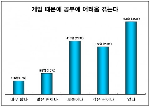 ‘게임 때문에 공부하기 힘들 때가 많나요?’라는 질문에는 ‘힘든 적이 없다’는 대답은 568명으로 35%에 달했고, ‘보통이다’는 대답은 419명으로 26%, ‘적은 편이다’는 372명으로 23%, ‘많은 편이다’는 대답은 10%, ‘매우 많다’는 6%로 나타나 “온라인 게임으로 인해 공부하기 힘들다”는 초·중학생이 16%에 달하는 것으로 조사되었다.