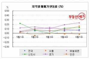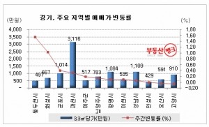 하지만 부천시(-0.13%)를 비롯한 김포시(-0.06%), 고양시(-0.06%), 오산시(-0.05%), 안성시(-0.02%) 등은 마이너스변동률을 기록했다.