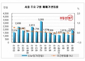 서울 유형별로는 일반 아파트가 0.09% 오름폭을 보였고, 주상복합아파트(0.03%)는 관악구와 성북구 일대 단지들이 강세를 보이면서 6주 만에 반등에 성공했다. 이번주 재건축 아파트값은 용산구 이촌동 일대 한강맨션, 한강대우, GS한강자이 등이 강세를 보이면서 전주보다 0.38%p나 오름폭을 확대, 0.48%의 변동률을 나타냈다.