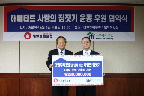 대한주택보증(사장 남영우)은 5일 서울 여의도동 본사에서 한국해비타트(회장 이창식)와 ‘2009년 한국해비타트 사랑의 집짓기’ 후원 관련 업무협약식을 가졌다.