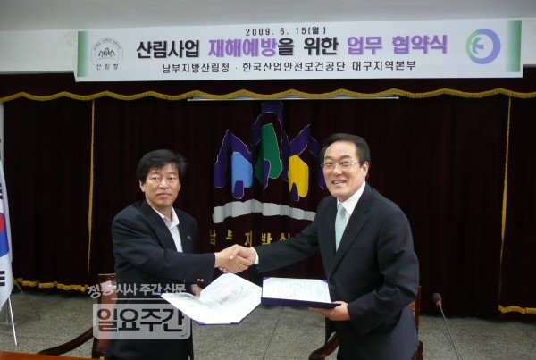 ▲ 한국산업안전보건공단 대구지역본부(본부장 김재호ㆍ오른쪽)는 남부지방산림청(청장 이장호) 회의실에서 ‘산림사업 재해예방’을 위한 업무협약 체결. |