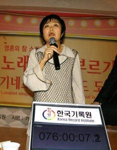 그러나 2007년 8월 미국의 마커스 라프래트(Marcus LaPratt)가 75시간으로 신기록을 수립하자 김씨는 50대 중반의 나이에 다시 도전에 나섰고, 마침내 지난 2월 18일 11시 14분부터 21일 15시 21분까지 사흘 밤낮을 쉬지 않고 노래하는 투혼을 발휘해 기네스 세계기록 도전에 성공했다.
